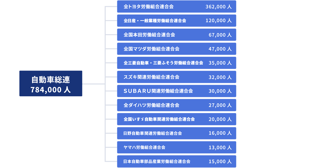 自動車総連は、企業グループ別の“労連”が結集した組織であり、12労連(784,000人)で構成されています。(2025年9月現在)